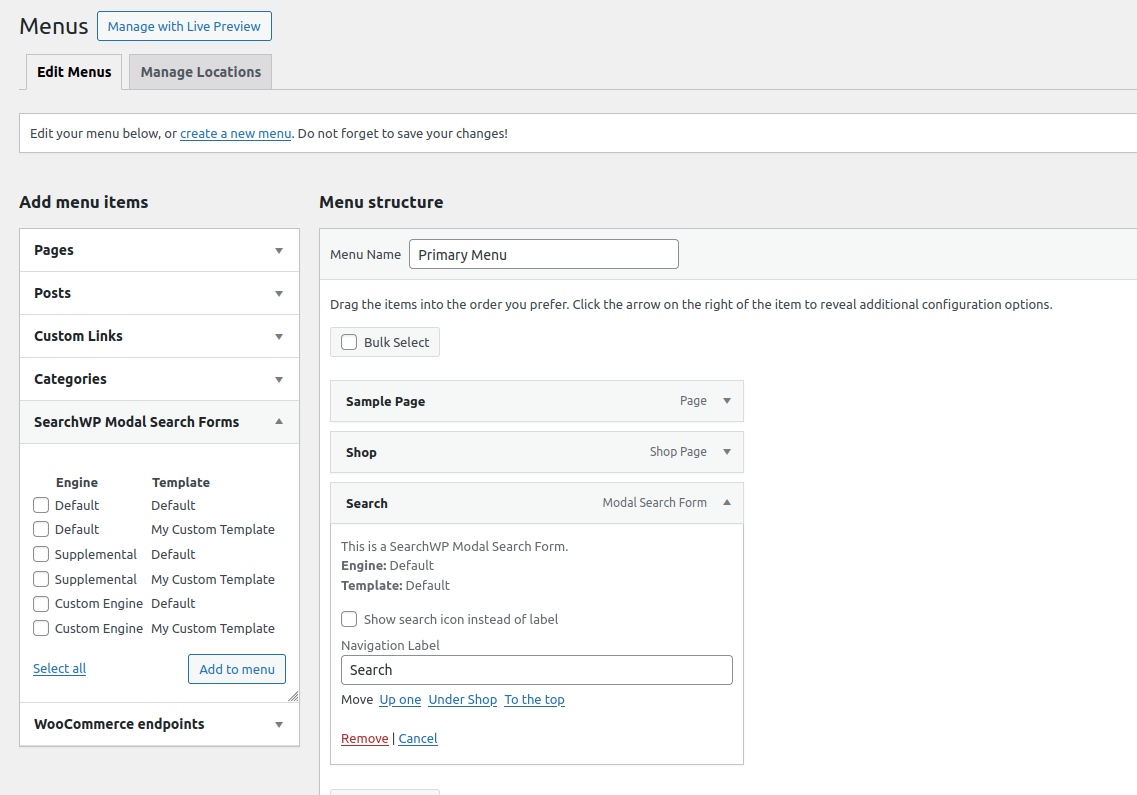 Once added, you can treat SearchWP Modal Search Form Menu Items as you would any other Menu Item, including additional customizations you may wish to put in place.