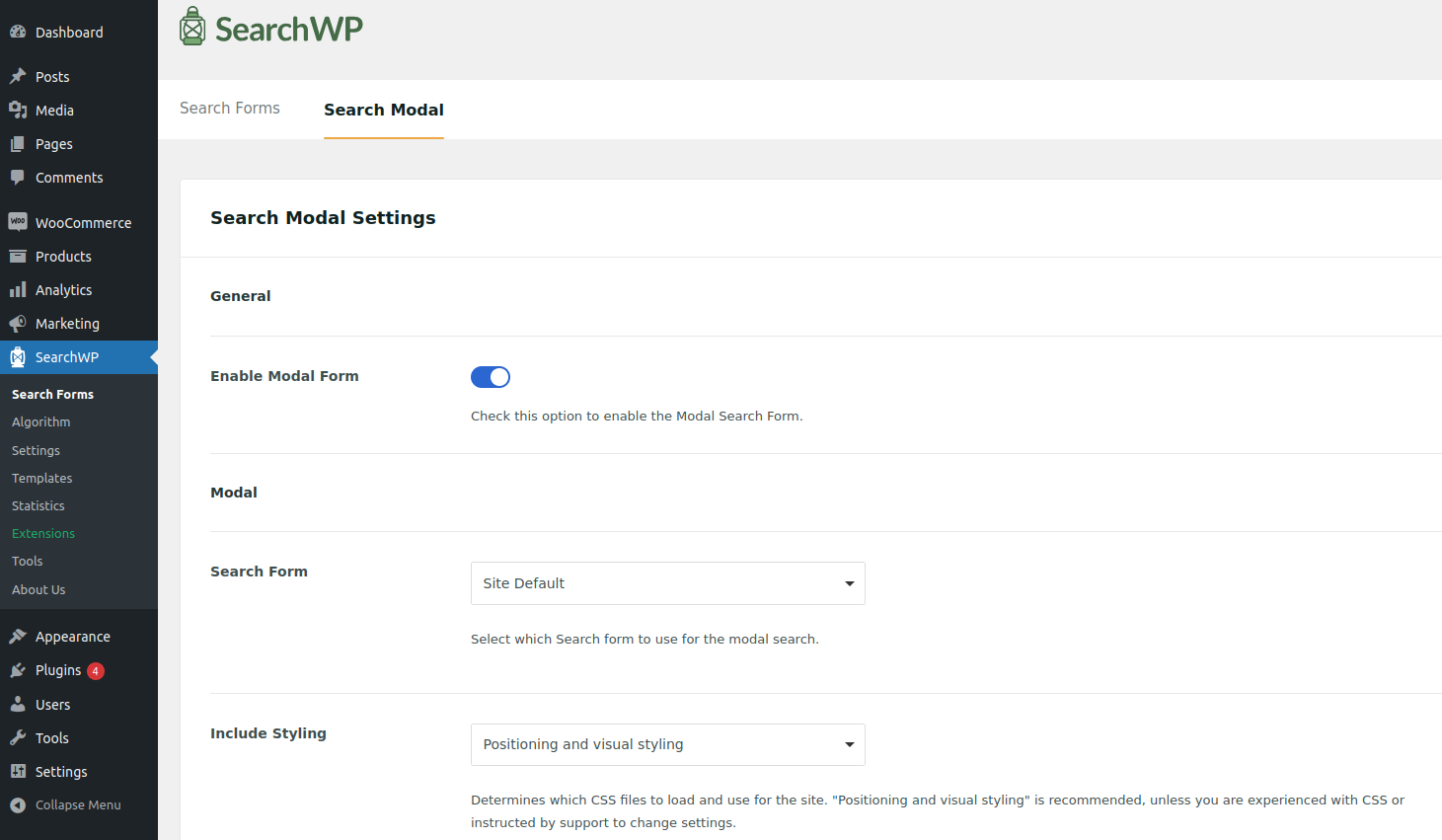 A toggle to enable or disable the SearchWP modal form functionality on your website.