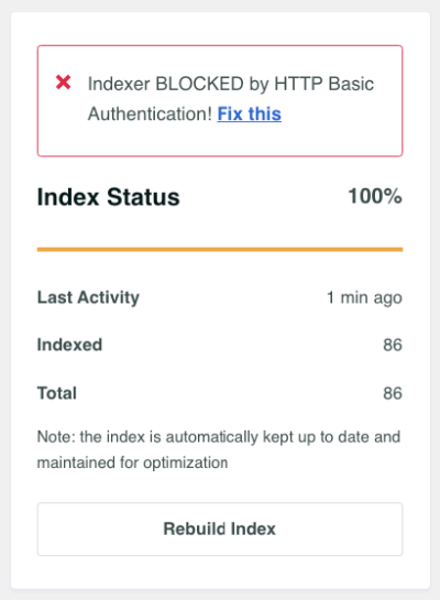 If your server has implemented HTTP Basic Authentication, you will need to provide the login information to SearchWP in order for the indexer to operate successfully. If SearchWP’s indexer cannot function due to HTTP Basic Authentication you will see this notice on the Engines tab of the SearchWP settings screen: