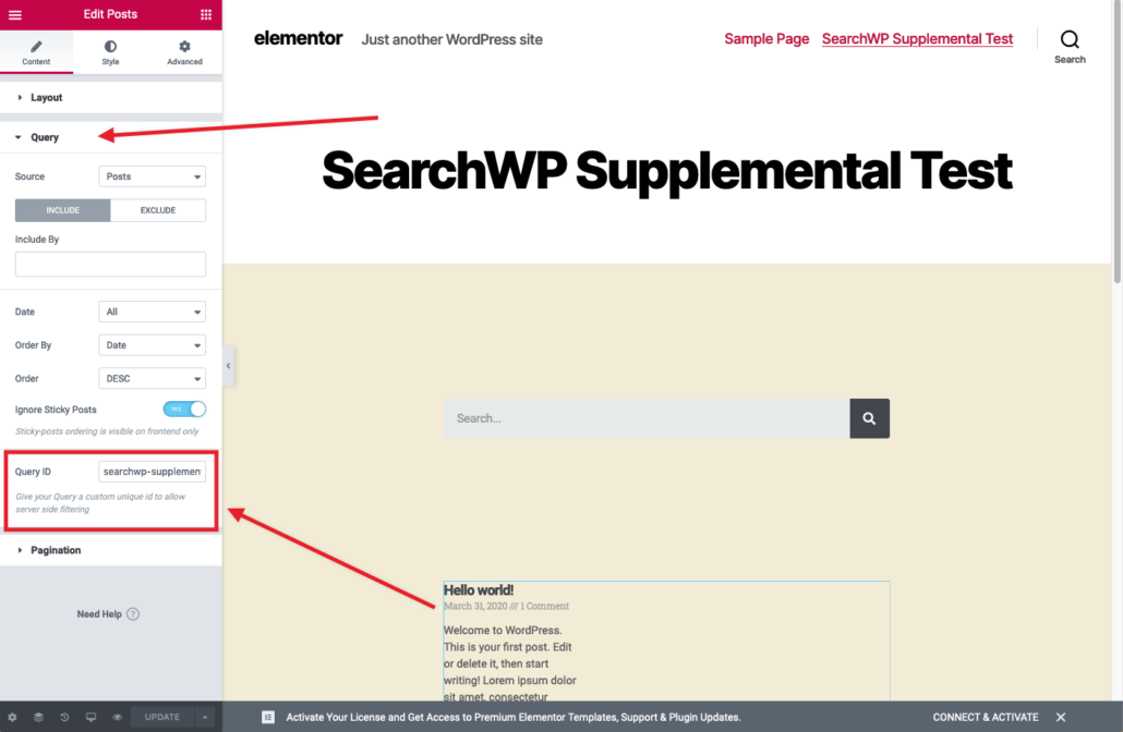 IMPORTANT: A Query ID must be set so we can flag it in a hook. Expand the Query pane for the Posts Widget and enter a unique Query ID. For this article we will use searchwp-supplemental: