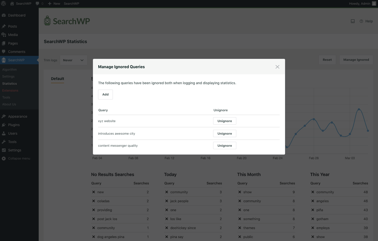 Search forms, like all web forms, are vulnerable to spam and bot activity. If you notice spam queries appearing frequently in your statistics, you can exclude specific terms by clicking the × button next to any query in the statistics interface. This prevents SearchWP from displaying that term on the statistics page going forward. The “Manage Ignored” button provides access to a complete list of all ignored queries, allowing you to review your exclusions and restore any terms that were incorrectly marked as spam by clicking to un-ignore them.