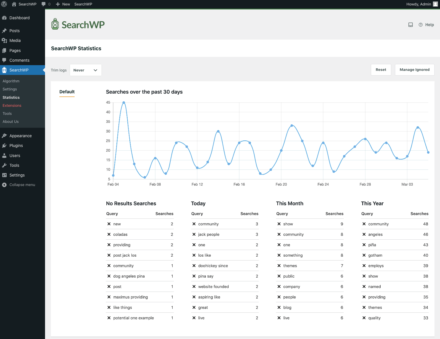 All recorded search data can be viewed and analyzed in the SearchWP > Statistics page within the plugin’s administrative interface.